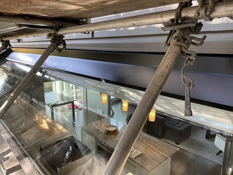 Once the asbestos abatement was completed, the homeowners noticed that their kitchen skylight was leaking. Because the stucco was gone, the original head flashing that kept water from getting between the window and the plywood was no longer functioning correctly. As a temporary measure, we installed a peel and stick flashing tape to seal the top of the flashing to the plywood, until we could design and install a new flashing.
